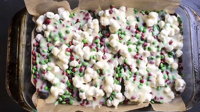 Step4Drizzle the sweetened condensed milk over the top of everything. Sprinkle on the remaining mini M&M’S™ and marshmallows.