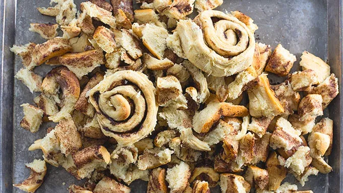 While still warm, cut or tear 8 of the cooked cinnamon rolls into bite-sized pieces, discarding remaining 2 rolls or saving for another use. Arrange pieces in a single layer on a large flat surface and allow to cool completely.