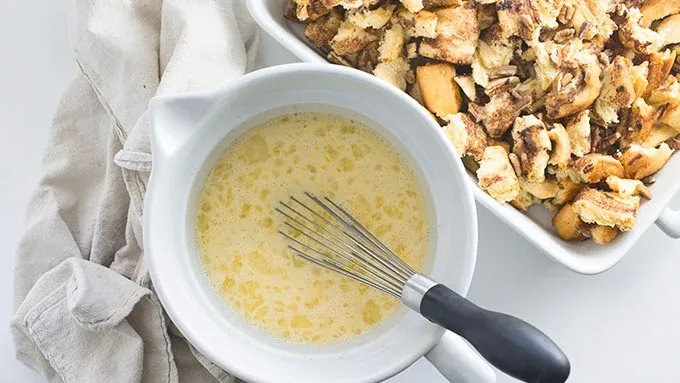 Add cinnamon roll pieces to a greased 9x13-inch baking dish. Sprinkle on the pecans.