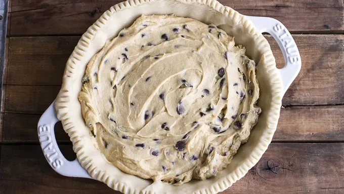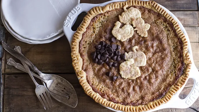 - Such a great pie. Such an EASY pie! I'm so excited because today we are talking about one of my favorite desserts. Today is all about the classic chocolate chip cookie pie. It was often made while I was growing up, especially on Thanksgiving, and most definitely on Christmas. This pie holds so many memories for me, plus it’s downright delicious! Our family really isn’t big on fruity pies. I think even my mom would agree that she is mostly to blame. For my mom, dessert isn’t dessert unless it includes chocolate, so naturally I picked that up. That meant our holiday pies were either chocolate chip cookie pie or chocolate pecan pie. Most time it was both – that’s just what you do during the holidays! When I started cooking and baking, this was one of the first pies I made. It’s SO easy that I got it right the very first time. My only little secret is to add vanilla extract. I swear, adding just a little vanilla makes all the difference. Oh, and double the chocolate. It’s just the way to go. Serve warm with ice cream and a drizzle of salted caramel sauce, if desired.