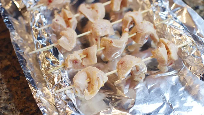 Step3Skewer the chicken and grill or broil until the chicken is cooked through. I prop the skewers onto aluminum foil and broil them to brown on both sides when I don’t have access to a grill.