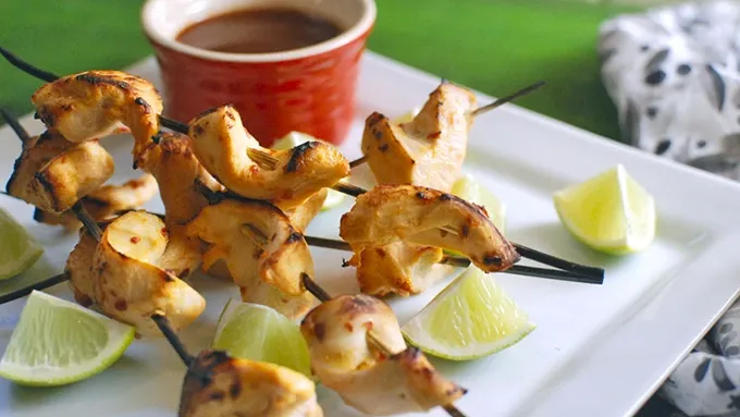 - Grilled chicken kabobs that will be the hit of your next party or barbecue. A little soak in some coconut milk really adds a creamy element to this chicken. I never expected the coconut to really impart a ton of flavor, but with a little chili and lime in the mix, the chicken ends up with a great unique taste! This dish is a super-easy appetizer. Mix a couple ingredients for a marinade; repeat for the dipping sauce, cook and serve. I don’t have a grill right now, so what I like to do is prop up the skewers on some aluminum foil and broil it to basically grill it from the top instead of the bottom. The sauce is sweet, sour, salty, and spicy, and goes great with the creamy and sweet coconut-lime chicken. These skewers will be a perfect finger food for your next get together!