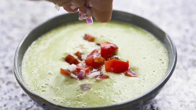 - Nothing fits the bill in summer like a no-cook recipe. This cool and creamy soup is as refreshing as it gets! We like ours topped with chopped purple onion and tomato. But there are a lot of other delicious pairings, as well. Sprinkle your soup with finely diced cucumber, fennel or scallion. Or try topping with grilled garlic shrimp and make it a full meal.