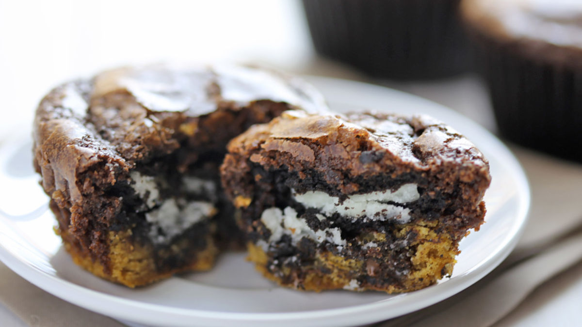 Step4Line 24 baking cups with paper liners, or grease with cooking spray. Spoon 1 tablespoon of cookie dough into the bottom of each baking cup, and press it flat into the bottom of each cup. Then place a chocolate cookie on top of the dough. Spoon 1 tablespoon of brownie batter on top of the cookie. The baking cup should be nearly full.