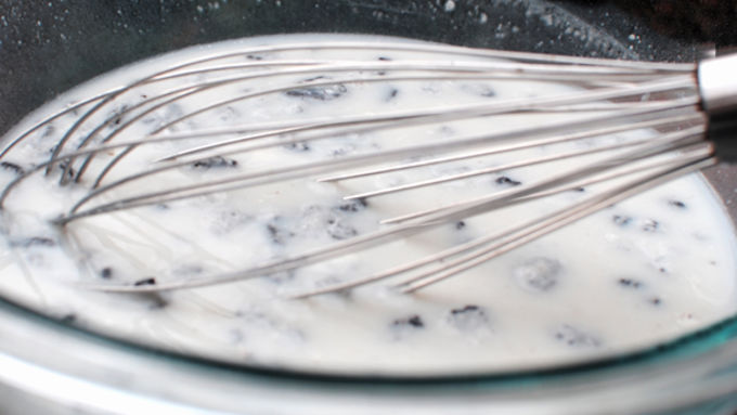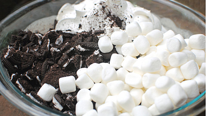 Step2Wait five minutes until the pudding is set, then add whipped topping (thawed), crushed chocolate sandwich cookies and marshmallows.