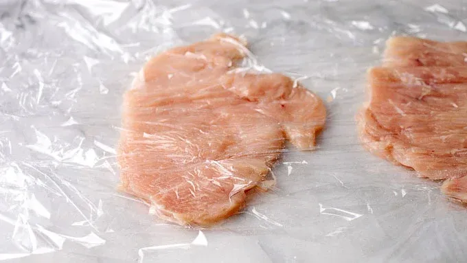 Step1Preheat oven to 350°F. Working with one chicken cutlet at a time, seal chicken cutlet between two pieces of plastic wrap and gently pound the cutlet until it’s an even thickness (about 1/4-inch).