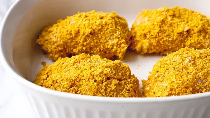 Step4Unwrap chicken pieces and dredge in flour, followed by egg, and lastly the Cool Ranch™ crumbles. Pack them on tight so the entire chicken piece is coated. Place finished chicken cordon bleu in a baking dish. Repeat with other pieces.