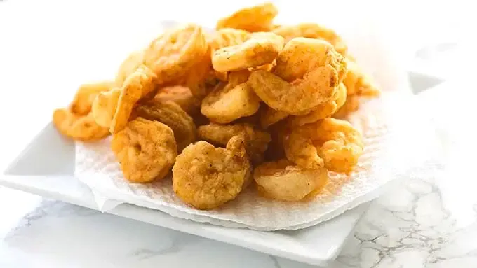 Step2Fry shrimp for 2-3 minutes or until golden brown and cooked through. Drain on a paper towel lined plate.