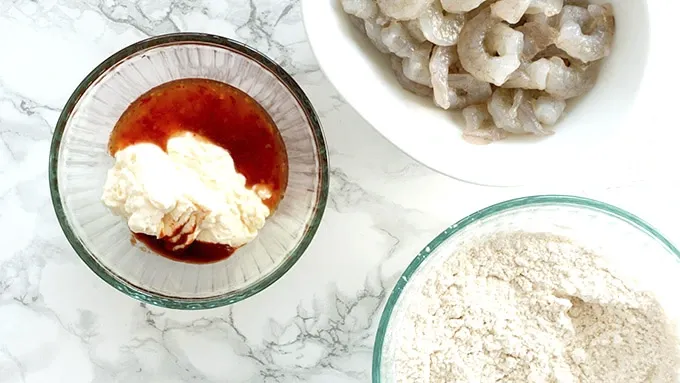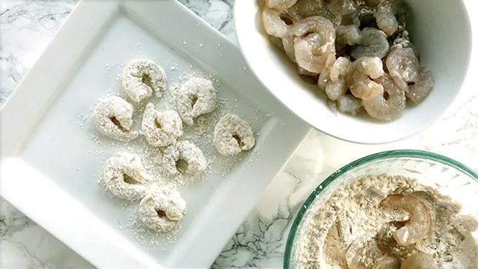 Step1Add 1 inch of oil to a large pot and heat over medium-high heat. While oil is heating, stir together flour, cornstarch, and seasoned salt. Coat shrimp in flour mixture.