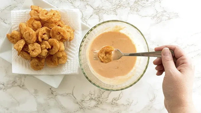 Step4Dunk shrimp in sauce to coat and place on plate to drain.