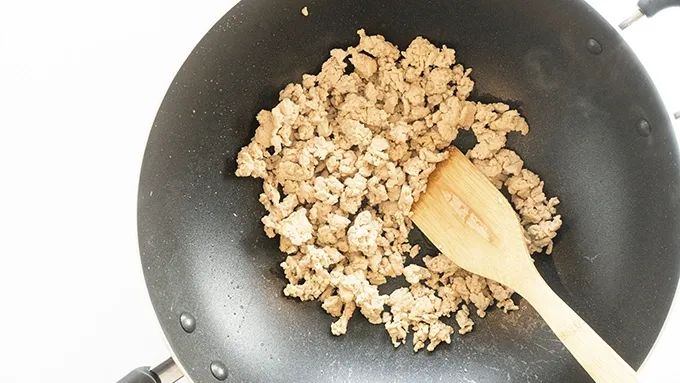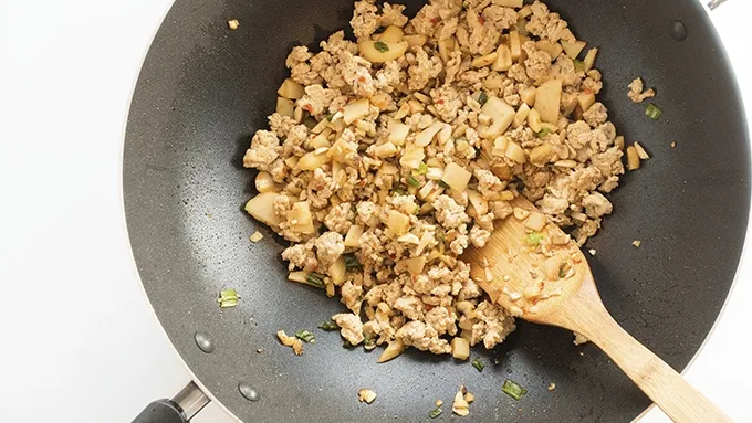 Heat wok over high heat with 2 tablespoons vegetable oil. Add ground chicken and cook until no longer pink, breaking it up as it cooks. Remove chicken to a plate and set aside.