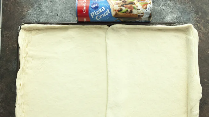 Step2Open 2 cans Pillsbury™ Classic Crust Pizza Crust. Roll out crusts on a lightly floured surface until they are slightly larger than half of the baking pan. Work the pizza crusts into the baking pan, making sure the dough goes up the sides and covers the entire pan. Pinch the dough seam together in the middle to meld the two crusts into one big one.