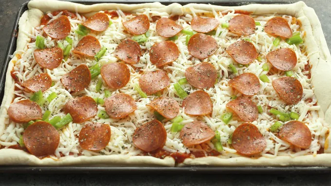 Step4Remove pan from oven and use a fork to push down any bubbles that have formed in the crust. Spread marinara sauce evenly over crust, working it all the way to the edges. Then spread on cheese, pepperoni, green peppers, and dried basil.