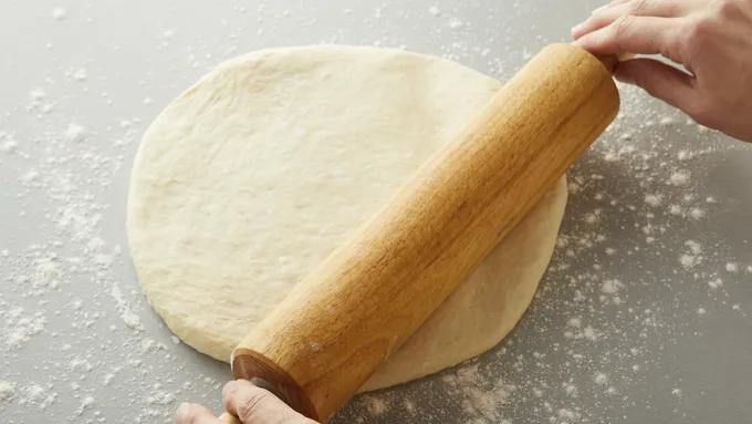 Step2Place one rack in upper third of oven and one in lower third of oven. Heat oven to 425°F. Spray 2 large cookie sheets with cooking spray. Remove plastic; on work surface sprinkled lightly with flour, roll dough to 16-inch circle. Use knife or pizza cutter to cut dough in half. Carefully transfer each half to center of a cookie sheet. Place 1 cookie sheet on each rack; bake 7 to 10 minutes or until crust just begins to brown. Remove from oven, and use fork to deflate any crust bubbles.