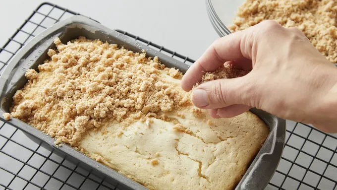 Carefully sprinkle streusel over top of partially baked bread. Bake 25 to 30 minutes or until toothpick inserted in center comes out clean. Cool 15 minutes. Loosen sides of loaf from pan; remove from pan, and place top side up on cooling rack. Cool completely, about 1 1/2 hours.