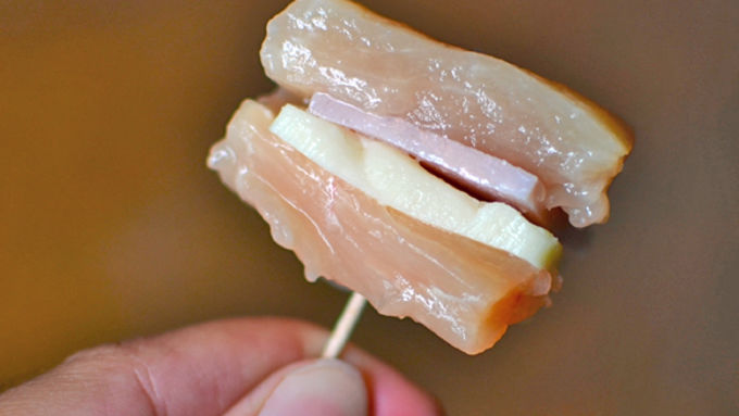 Step2Slice the ham and cheese into squares the same size as the chunks. Sandwich a piece of ham and a piece of cheese between each pair of chicken chunks and secure with a toothpick.