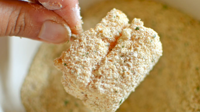Step4Dunk each chunk into the flour mixture, then the egg mixture, and then the breadcrumbs, then place on a greased baking sheet. You can leave the toothpicks in for now.