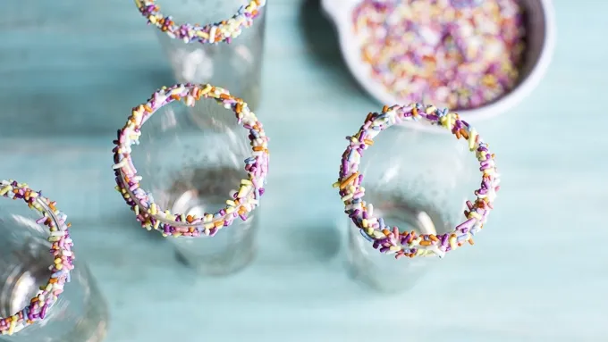 Step1To rim the glass with sprinkles, dip each shot glass into melted white chocolate and then roll in sprinkles. Place in the freezer.