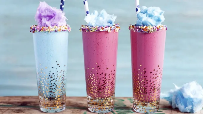 - Could these milkshakes be any cuter? Or more fun? I know we’re all adults here, but you cannot deny there are some things about being a kid that you miss. Like being able to sleep in all summer long, or being able to eat cookie after cookie and not feel bad about it, or just being able to be carefree and not have a care in the world. Why not have a little fun and embrace the kid inside of us with some milkshakes? These are everything any kid would LOVE (minus the optional vodka, of course). If you have kids and make these milkshakes, not only will they love you for it, but I have a feeling all the neighborhood kids will love you too. When making these, do not blend the cotton candy colors in the blender—it is not pretty! You can, however, layer 2 or 3 colored and already blended milkshakes in a glass. That is very fun! Cotton candy milkshake everyone will love, even adults! They’re delicious! Enjoy!