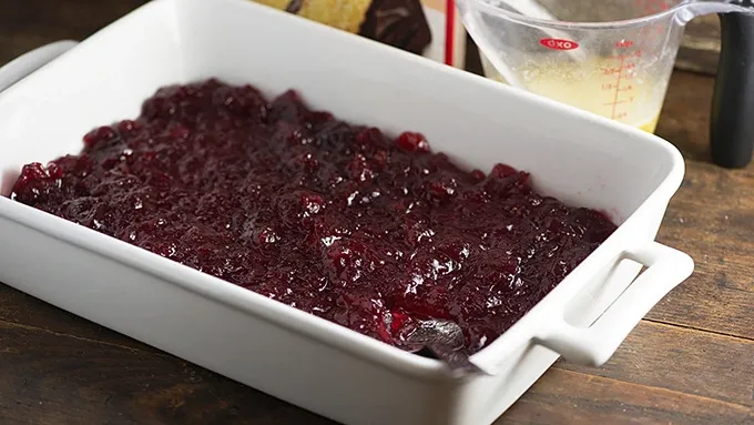 Step1Preheat oven to 350° F. Spray a 9 x 13-inch baking dish with non-stick cooking spray. Spoon cranberry sauce into prepared pan. Break it up and arrange in an even layer.