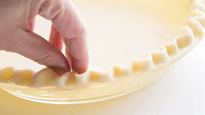 Step2Drape a Pillsbury™ dough round into a 9 inch pie pan. Gently pinch the edges together decorative-style, and place some pie pearls on the bottom of the pan. Don’t have pie pearls? No problem! Toss about 1 1/2 cups of dry pinto beans into the bottom of your pie crust before baking.