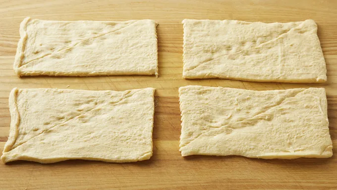 Step2If using crescent rolls: Unroll dough; separate dough into 4 rectangles. Firmly press perforations to seal. If using dough sheet: Unroll dough; cut in half horizontally and vertically to form 4 rectangles.