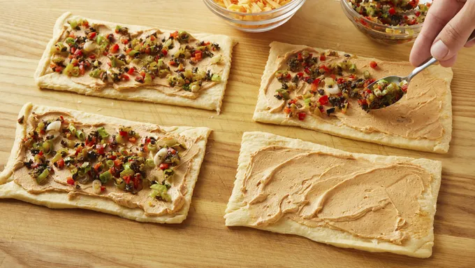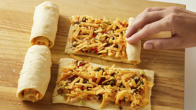 Step3Spread each rectangle with about 2 tablespoons cream cheese mixture. In small bowl, mix olives, jalapeño, bell pepper and 1 tablespoon of the green onion. Divide olive mixture among rectangles; top with shredded cheese.