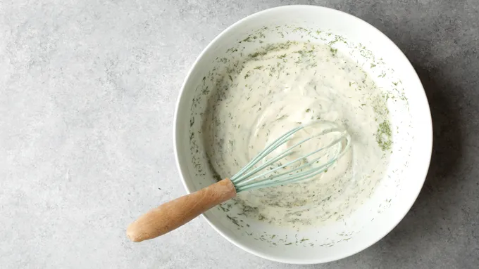 Step1In a large bowl, whisk together the yogurt, dill, garlic powder, lemon juice, vinegar, sugar, salt and pepper.