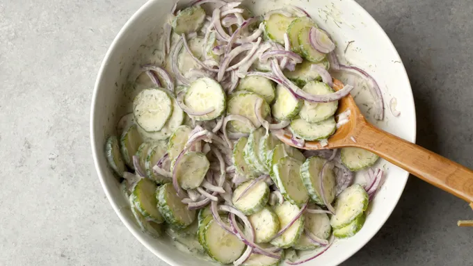 - If you could hop in a time machine and travel back to my kitchen table during summers when I was a kid, you’d probably find this Creamy Cucumber and Red Onion Yogurt Salad (or as we simply called it, “Cucumbers and Onions”) on the table. Like most of the best food in the world, it’s gloriously simple—and tastes way better than you’d think it would based on the short ingredient list. The key to the great flavor? Fresh cucumbers and onions. This salad is perfect for when cucumbers are growing by the bushel-load over summertime. (Seriously, check your farmer’s market; by the time mid-summer rolls around, they might pay you to take some.) This side dish is cool, creamy, and the perfect way to balance out the smoky flavor of grilled food. You can also spiralize or very thinly slice the cucumbers and onions and make it into a slaw that is great on top of pulled pork!