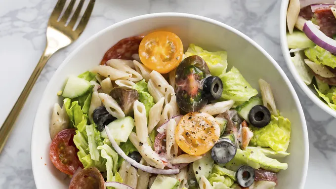 - The classic Italian sub comes to life in a tasty pasta salad. All of the flavors of you love—salami, olives, tangy purple onions—tossed together with pasta and a creamy, zingy Italian dressing. This dish takes about 20 minutes to make, and is just right for a simple lunch or lovely light dinner. The pasta needs a quick boil, but other than that this is a completely no-heat recipe. Serve this up on summer nights when the weather outside is too hot for turning on your oven. Tote a double batch to your next potluck (it’s sure to disappear quick!), or prep all of the ingredients the night before, then toss together at lunch for a fresh brown bag option.
