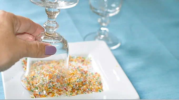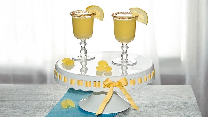 Step2Optional: Rub a lemon wedge around edge of 2 glasses, then dip rims in colored sugar. Set aside.