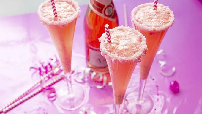 - There’s nothing that says “party” quite like pink champagne. Like a glass of Marilyn Monroe, all decked out and ready to steal the show, fill a cocktail cup with a bit of blushy bubbly and you’ve added instant sparkle to just about any occasion. With this pretty pink cocktail, you can add a kiss of sweetness to your celebration, too. Pretty pink champagne, mixed with mulled strawberries and a splash of creamy pina colada mix (or melted ice cream—you pick the flavor combo here!) creates a gorgeous party punch that tastes like a bellini in a bikini. It’s pure cocktail perfection. If your glasses are big enough, you can add a pretty pink straw. Or simply give to your guests let them sip to their hearts content. This bubbly little sipper is sure to be a party time starlet. Serve and enjoy!