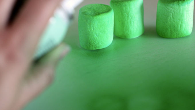 Step2Spread a piece of parchment in your work area. Spray 8 of the marshmallows with the purple food spray. Spray 8 with green food spray. Leave 8 of them white.