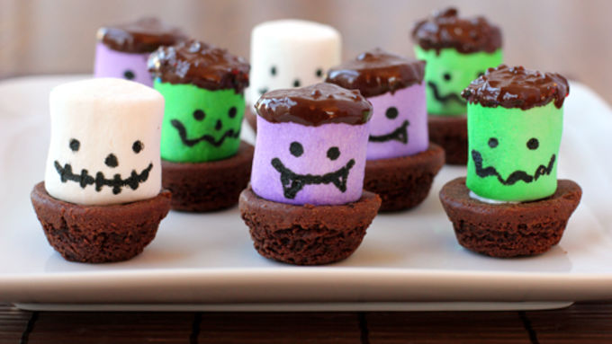- Get ready to wow all those little spooks that will be trolling the neighborhood! Your little ghosts and goblins are going to love these freaky little Creepy Brownie Bites that are chock full of Halloween fun. Making these Halloween marshmallow brownie bites isn't difficult at all, but they do require some special tools, so plan on making a quick trip to the grocery store for the ingredients and the craft store for embellishments. The first trick to making these fun little treats is to grab bottles of green and purple food spray. You should be able to find them in the cake decorating section of a craft store. All you've got to do is spray large marshmallows with a light coating of either spray to make them ghastly colors. The next little trick you need in your kitchen is an edible marker. Use it to draw some funky faces on your marshmallows. I thought the green marshmallows were begging for a squiggly Frankenstein smile, the purple needed a sly vampiric grin, and a stitched up smirk looked about right for those white marshmallows, which were about to turn into skeletons. Dot on two eyes, dip the tops of your purple and green marshmallows in melted chocolate (and chocolate sprinkles for those green marshmallows! Frankenstein needs some freaky hair, y'all!) then place a dollop of chocolate frosting on top of some Betty Crocker brownies baked in a mini muffin tin. Gently press the marshmallows onto the brownie bites. Then sharpen your teeth, because … it's going to be love at first bite!