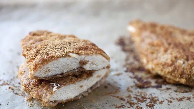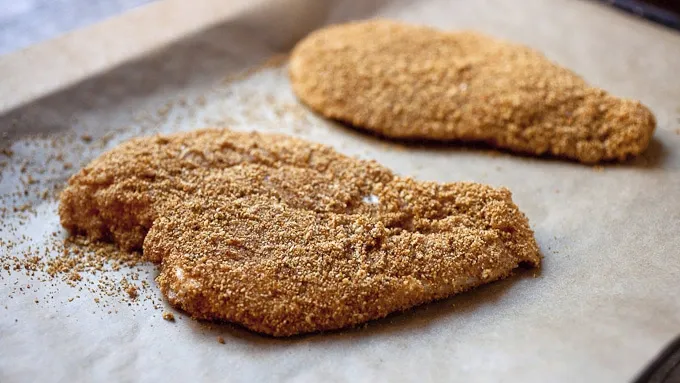 Step3Dip chicken in flour mixture, then in egg, then finally in the crispy breadcrumbs. The chicken should be completely coated in breadcrumbs. Place coated chicken pieces on a baking sheet lined with parchment paper.