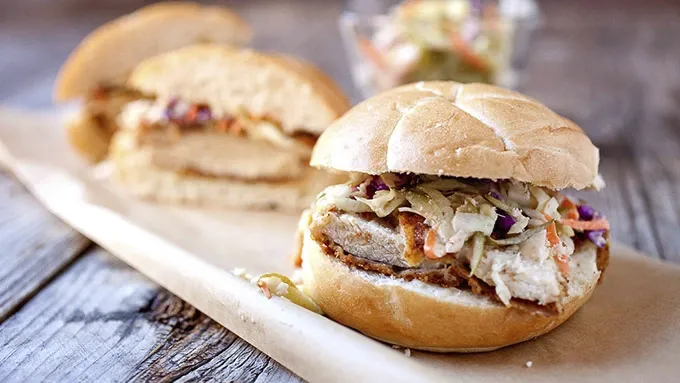 Step6Serve baked crispy chicken pieces on toasted rolls with big spoonfuls of slaw.