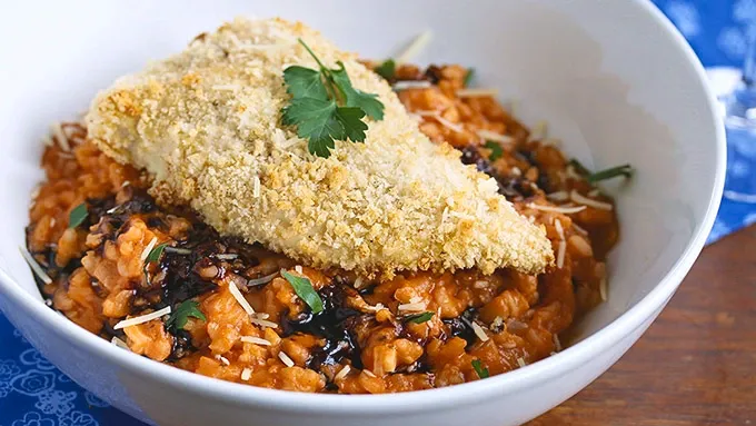 - This dish proves that risotto is not so difficult to make and totally delicious. Making risotto is a kind of culinary art unto its own. Using a special kind of rice (most commonly Arborio), it cooks up nice and creamy with a delightful bit of chewiness to it. You can find entire cookbooks devoted just to risotto. Clearly it has a very devoted following! Risotto tends to have an upscale connotation, but it’s really very simple to make – it just requires you to follow a particular method, which we’ll demonstrate today. Here's a delicious risotto dish that looks and tastes gourmet but is easy to prepare. The risotto is cooked in broth combined with pureed fire-roasted tomatoes for a wonderful smoky edge. It’s then drizzled with a simple sweet and tangy balsamic reduction and topped with super easy baked crispy chicken. It’s all easy to prepare but there are multiple layers of flavor and texture going on here. And it’s those different layers that make a dish not only delicious but also interesting as you explore each layer. You’ll be congratulating yourself by the time dinner’s over, and so will your guests!