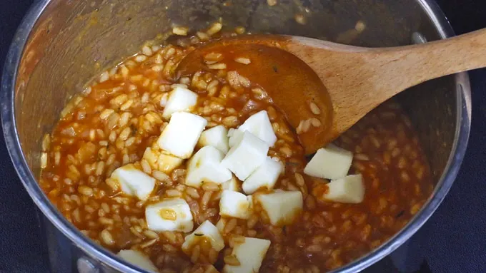 Step5Add about 1/4 of the hot tomato broth. Cook, stirring regularly, until most of the liquid has evaporated, then add another 1/4 of the broth. Continue adding the broth 1/4 at a time, regularly stirring while the rice absorbs the liquid. The rice will begin to swell and become somewhat creamy in texture. The process will take 20-25 minutes. Add mozzarella and stir until melted. Add salt and pepper to taste.