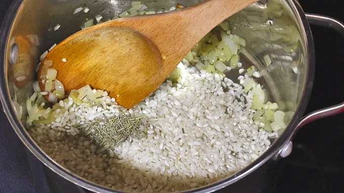 Step4Heat the oil in a medium saucepan (preferably deep, but narrow in diameter) over medium-high heat and cook the onions until soft and translucent, 5-7 minutes. Add the garlic and cook for another minute. Add the rice and seasonings, stir and cook for 1 minute.