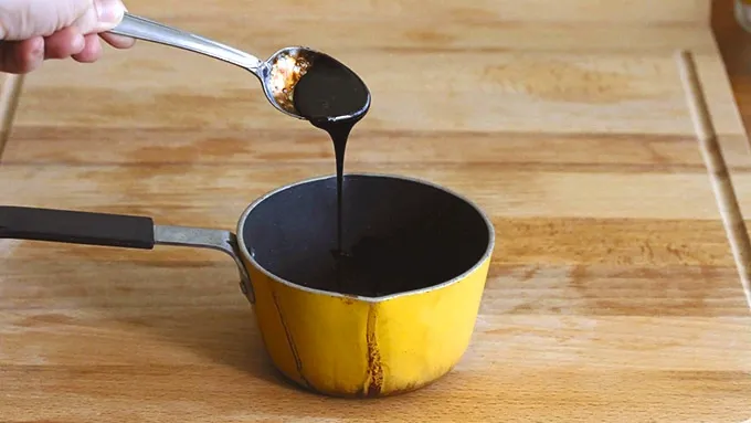 Step2Get the balsamic reduction going. Pour the balsamic vinegar into a small saucepan and bring to a boil. Reduce the heat to a low simmer and, stirring occasionally, simmer the vinegar until the quantity has reduced by about half and the vinegar coats the back of a spoon. Be careful not to overcook or it will harden like stiff taffy.