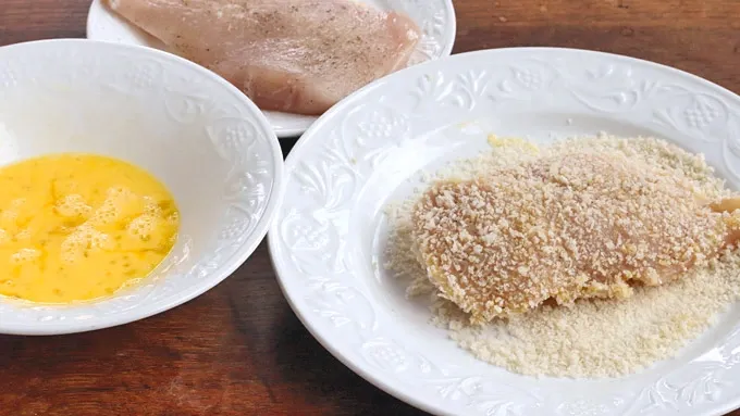 Step1Preheat the oven to 375°F. Sprinkle the chicken with salt and freshly ground black pepper. Dip each cutlet into the beaten egg and then thoroughly coat them in the breadcrumb/Parmesan mixture. Lay the breaded chicken on a lined cookie sheet in a baking dish and bake for 20-25 minutes or until the chicken is done and golden.