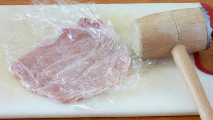 Step1Place the pork chops between two sheets of plastic wrap and pound them with the flat side of a meat tenderizer until they're 1/4 inch thick. Sprinkle lightly with salt and freshly ground black pepper. Set aside.
