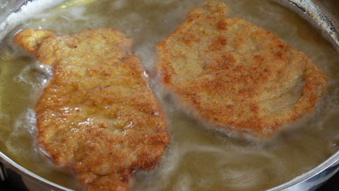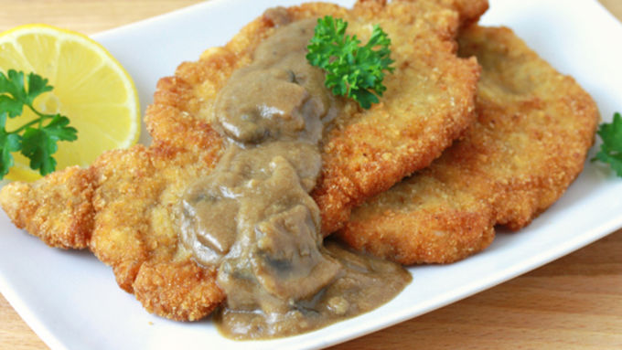 Step6Fry the Schnitzel for about 2-3 minutes on both sides. When they're a deep golden brown, transfer them to a plate that's lined with paper towels. Serve immediately with the mushroom gravy and your choice of sides.