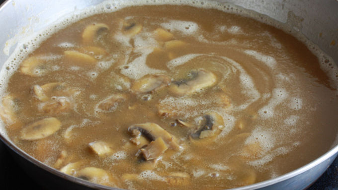 Step4Slowly add the beef broth, whisking constantly, until combined. Return the mushrooms to the skillet. If using canned mushrooms, you'll add them at this point. Bring the gravy to a simmer, reduce to low, and simmer uncovered for about 15 minutes or until the gravy is thickened. Season with salt and pepper.