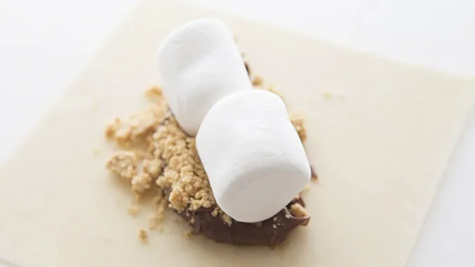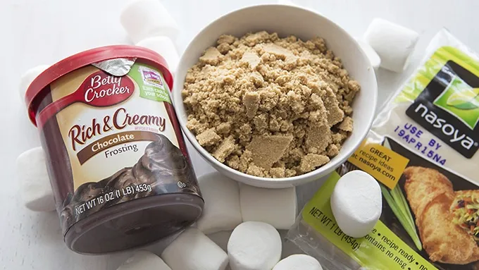 Step2Spoon 2 tablespoons of frosting into the center of each egg roll wrapper. Sprinkle 1 tablespoon of crushed graham crackers on the frosting, and top with two marshmallows.