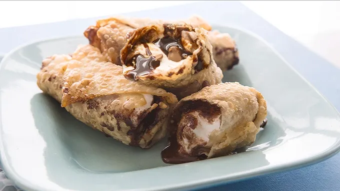 - S'mores on a whole new level – fried into a crispy crunchy spring roll. This delicious party treat will have them all talking... with their mouths full. Put out the campfire and head inside this spring! No, we’re not advocating more time indoors, but that’s where all the magic happens with this 20-minute dessert recipe. If you love spring as much as we do, then you’ve got to get Crispy S’mores Spring Rolls in your life – NOW. They have all the best parts of a s’more—gooey marshmallow, melted chocolate, and crunchy crackers. Only in this version, the crunchy cracker is actually a quick-fried crispy roll, cooked until golden and filled with gooey chocolate-marshmallowy goodness. To make this recipe, you’ll need just a few simple ingredients and an insatiable craving for fast s’mores. Because you’re about to have these babies coming hot off the stove and ready to serve! These spring rolls are best right out of the fryer, making them the perfect lazy party treat for when everyone is gathered in the kitchen and ready to eat whatever you make them! Drizzle with chocolate sauce and serve 'em up! Crispy Spring Roll S’mores. They may be the best thing since… well… s’mores.