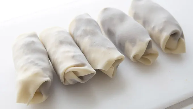 Step3Moisten the edges of the egg roll wrappers with a little water, then fold in 2 of the diagonal end corners to the center and roll the wrapper egg-roll style over the marshmallows, tightly securing the ends so the filling doesn't seep out while frying.