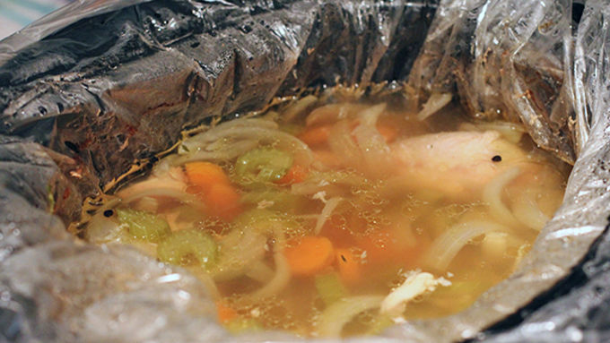 Step2Once cooked, remove the chicken with a slotted spoon and discard the bones. The chicken should just fall apart, but if there are large pieces, use a fork to shred. Then return chicken to the soup.