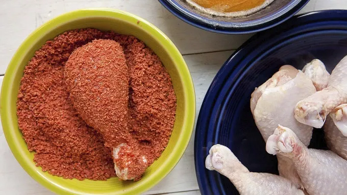 Step4Dip each drumstick in the butter mixture and then in the crumbled chips. Place each drumstick in the lined baking dish.