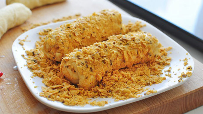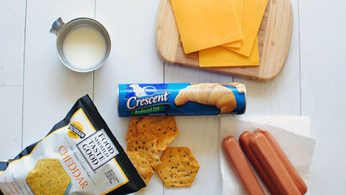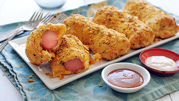 Take crescent dogs up a notch with slices of American cheese and covered with crunchy nacho cheese flavored tortilla chips.